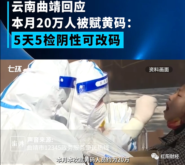 11月23日,澎湃新闻报道,云南曲靖20万人被赋黄码。黄码转阴的条件是5天5检。