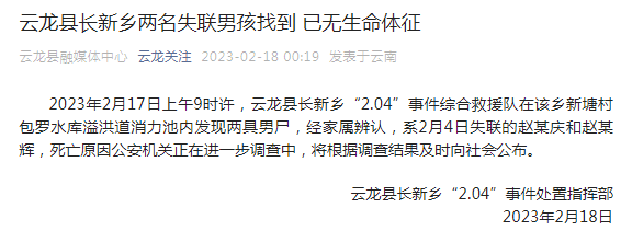 据“云龙关注”微信公众号消息,2023年2月17日上午9时许,云龙县长新乡“2.04”事件综合救援队在该乡新塘村包罗水库溢洪道消力池内发现两具男尸,经家属辨认,系2月4日失联的赵某庆和赵某辉,死亡原因公安机关正在进一步调查中,将根据调查结果及时向社会公布。