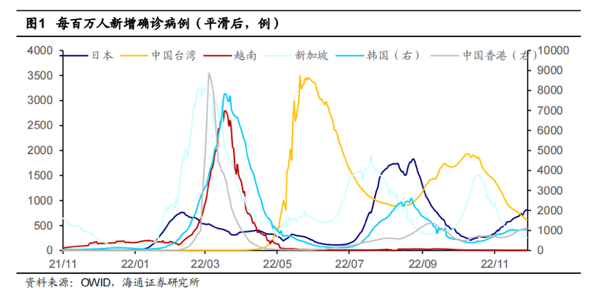 海通证券整理了日本、韩国、中国香港、中国台湾、越南、新加坡等经济体的疫情走势,发现重症高峰的严峻程度,取决于疫苗接种情况、重点人群占比和医疗资源。