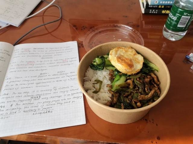 音子在酒店边吃外卖边背英语