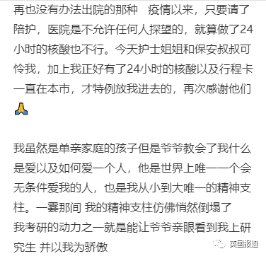 最疼她的爷爷因为脑梗、心梗和肠癌中晚期长期住院,疫情期间她没法去探视。想念爷爷的郑灵华好不容易得到了医护人员的通融,才能进去和已经在弥留之际的爷爷见上一面。