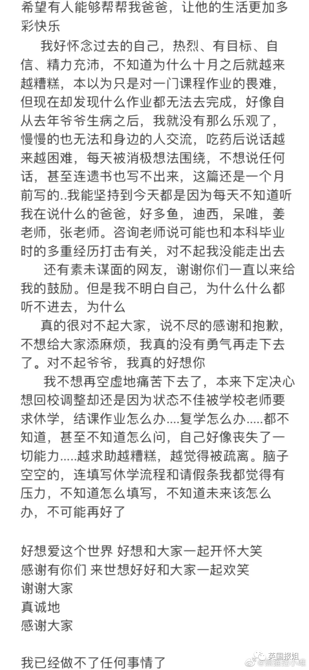 这之后她再也没有发布新的帖子。她的朋友说,曾经收到她绝望痛苦的信息,她非常想要自杀了却痛苦,但又深知这会让还爱着她的人受伤。她说自己不敢去死,但实在太痛苦了。