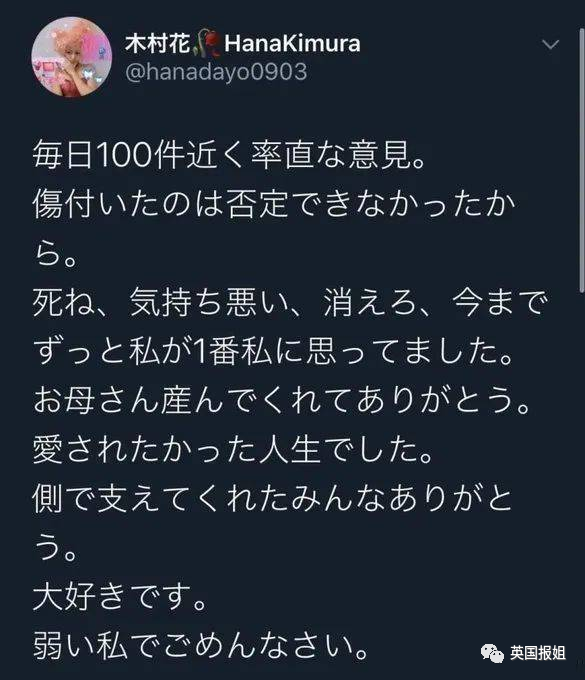 2020年5月,日本摔角选手木村花在真人秀中因为和一名嘉宾起了一些小冲突,就被网友疯狂“炎上”(日语中“全网集体指责”的意思),每天收到一百多条骂人的信息。他们让她去死、让她消失、骂她恶心。