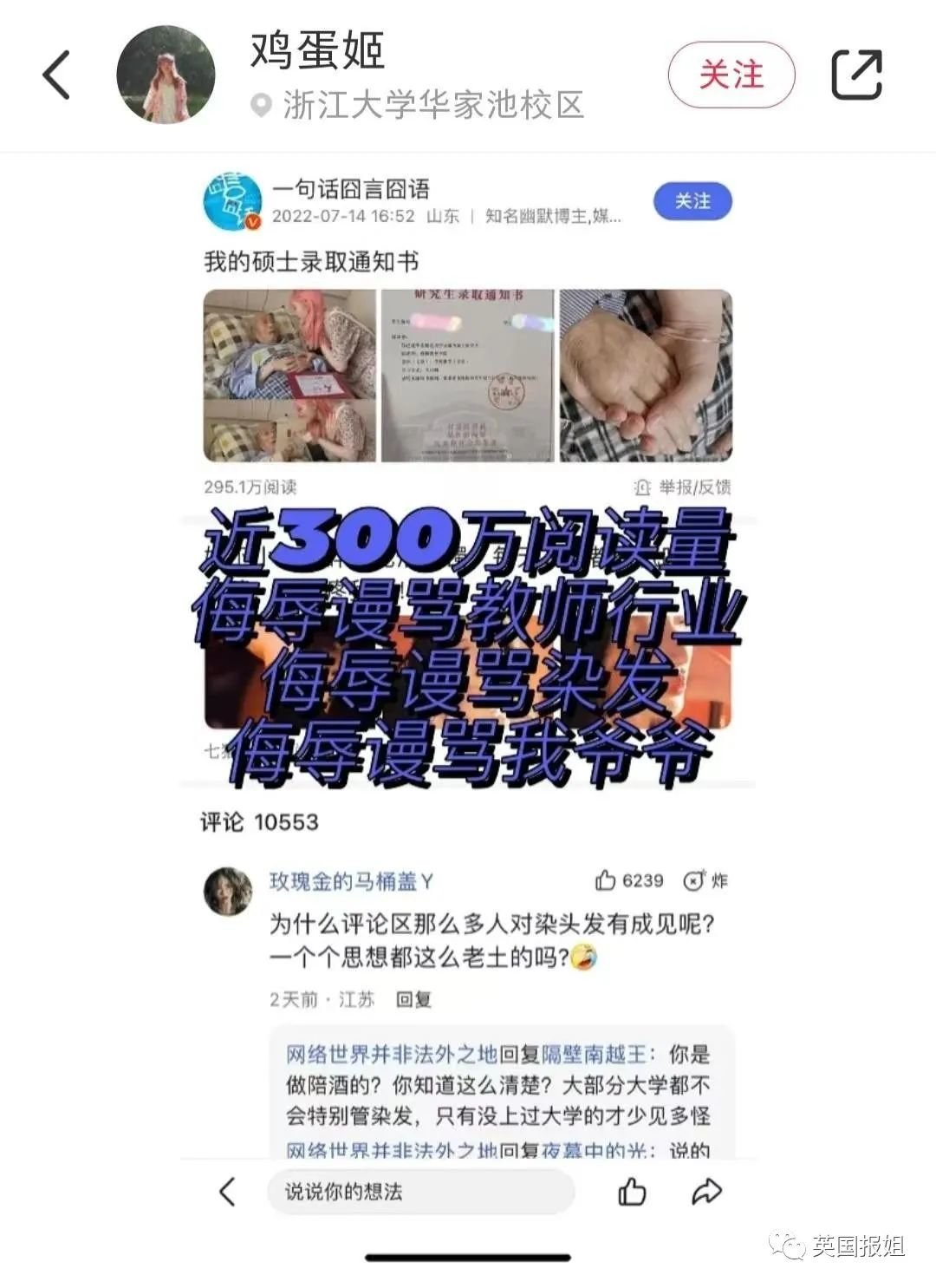 有人到处看图说话,写文章造谣她和爷爷的关系,说她看发型就是“被包养的”。有人则说粉头发像陪酒女,不可能是学师范的,更不可能被保研。