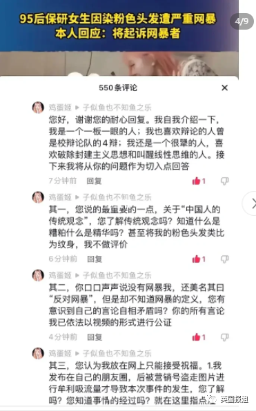她一边学习、一边积极维权,还经常会据理力争、逻辑严密地告诉骂他的网友:如果我真的成为老师,我会按照规定留合适的发型,但我现在只是一名学生,我有权染喜欢的颜色。