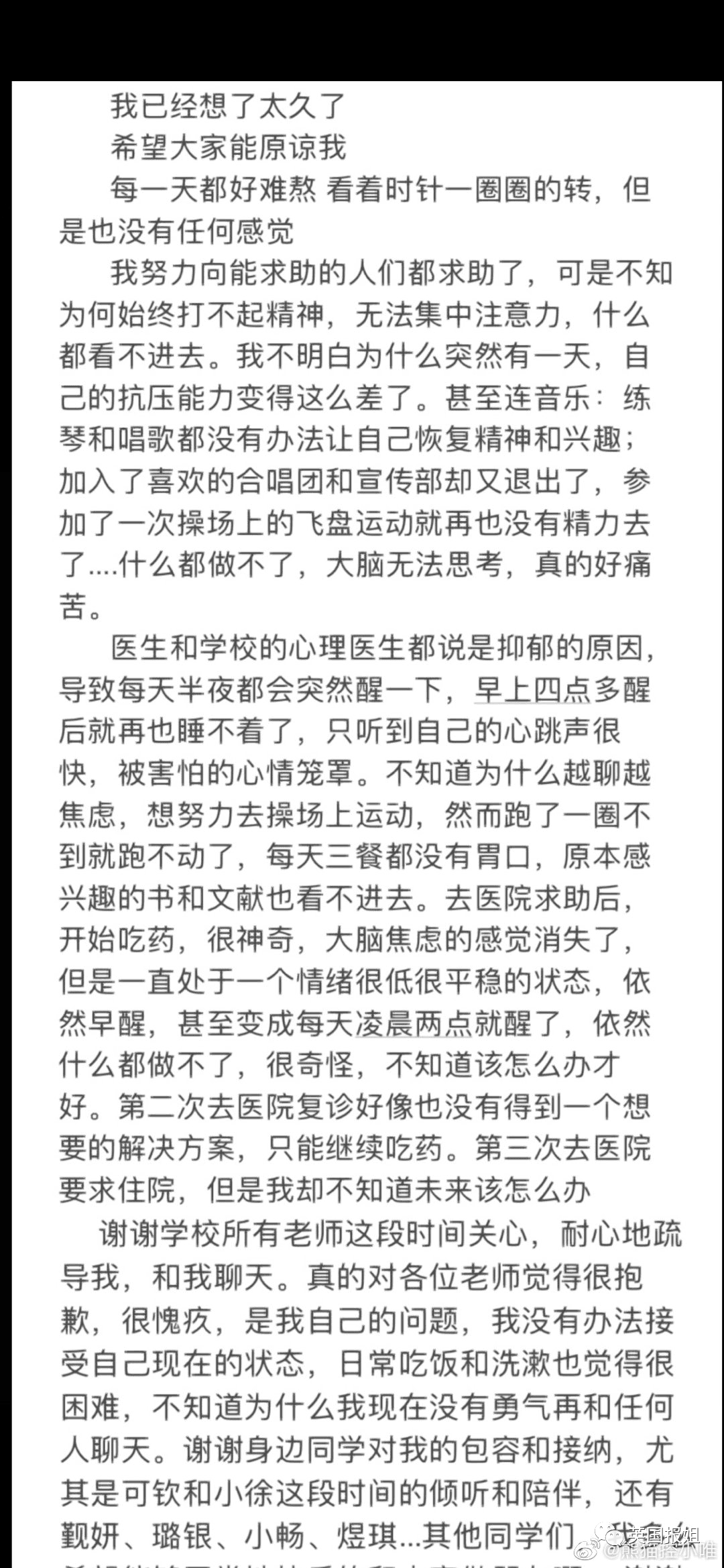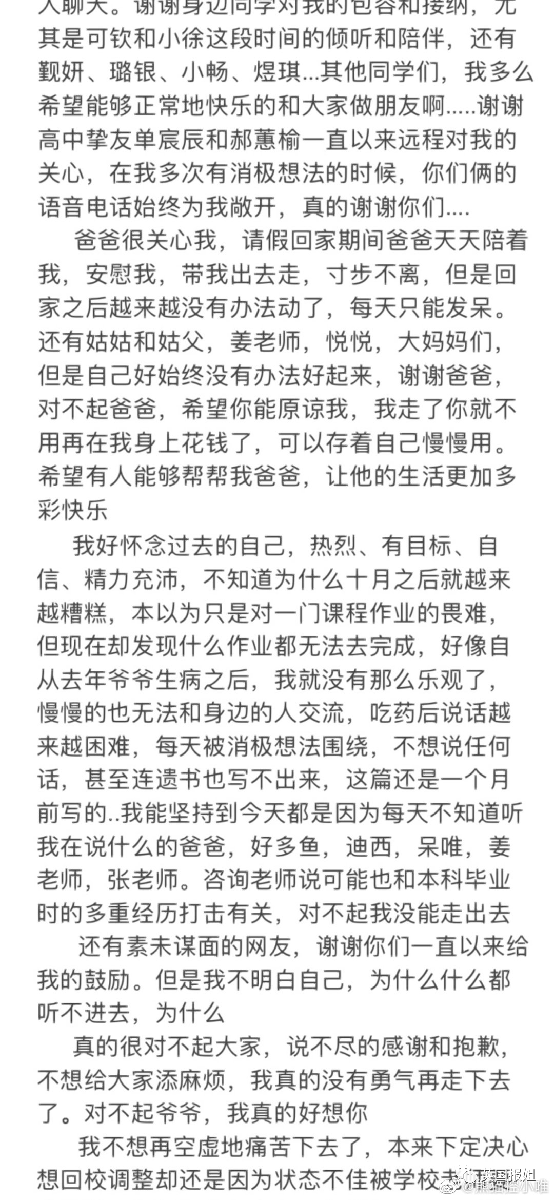 在她的遗书中,她不停地向家人和朋友道歉,责怪自己没有力气继续活下去,责怪自己不够坚强。但我们都知道,这根本不是她的错。