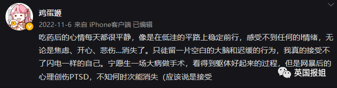 然而网暴后的PTSD(创伤后应激障碍)真的太严重,再加上心爱的爷爷也在这段时间去世了,她再也没法像之前一样乐观向上了。