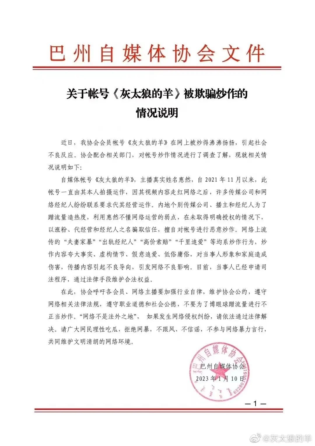 1月11日,巴州自媒体协会发出声明,提到自2021年11月以来,“灰太狼的羊”账号一直由其本人拍摄运作,因其视频内容走红网络之后,个别传媒公司、播主和经纪人为了蹭流量造热度,在未取得明确授权的情况下,以涨粉、代经营和经纪人之名骗取信任,擅自对账号进行恶意炒作。