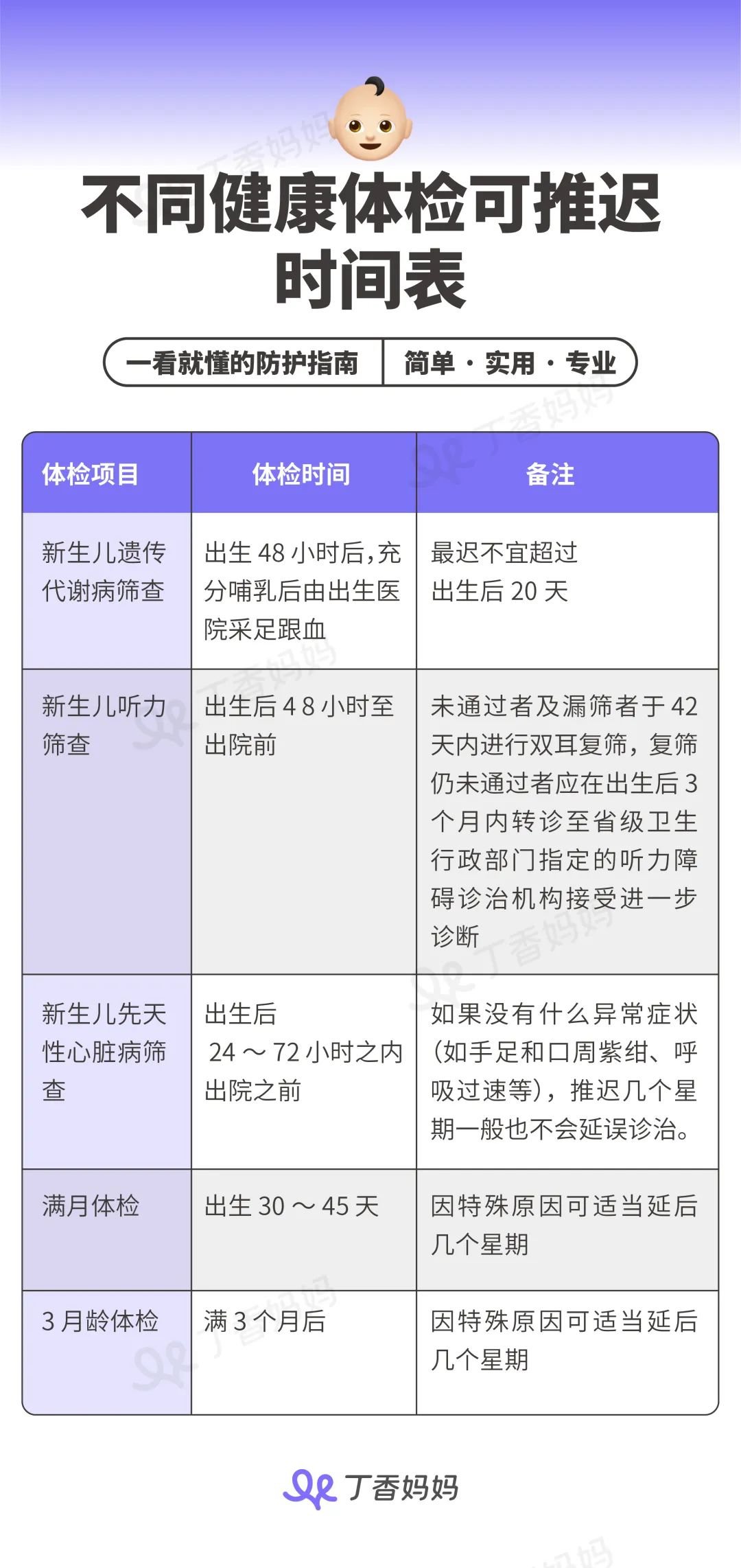 需要注意的是,如果是出生前后有高危因素的宝宝,比如早产儿、低出生体重儿、曾在新生儿期住院、孕期有异常等情况的,需要根据医生的建议,增加健康检查频次,是否可以延后,建议家长及时跟医生沟通。