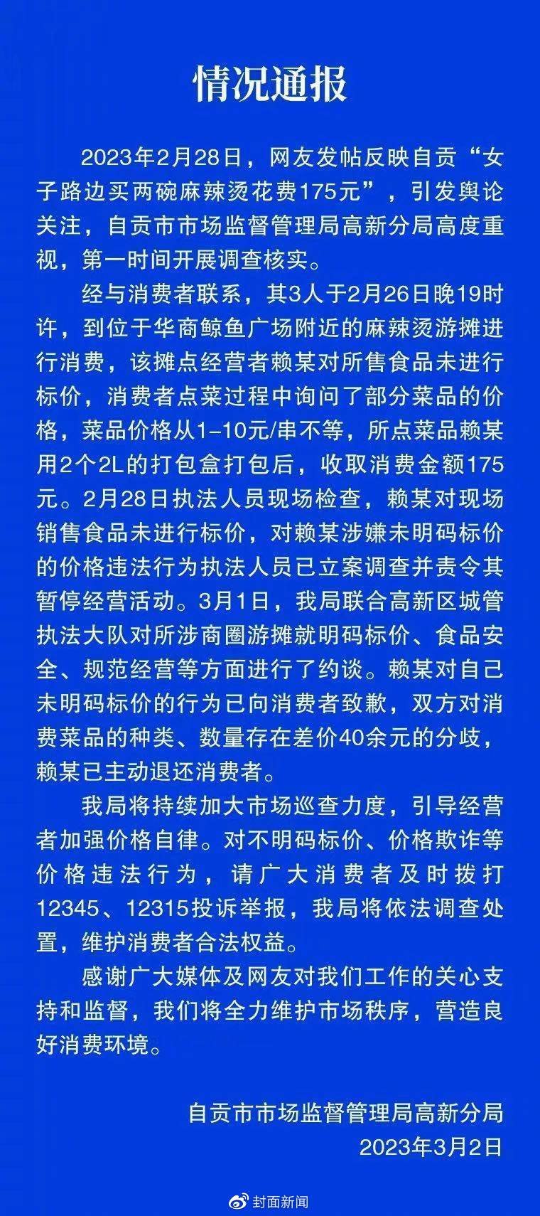 女子买两碗麻辣烫花175元 官方:摊点未明码标价,责令停业