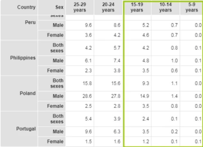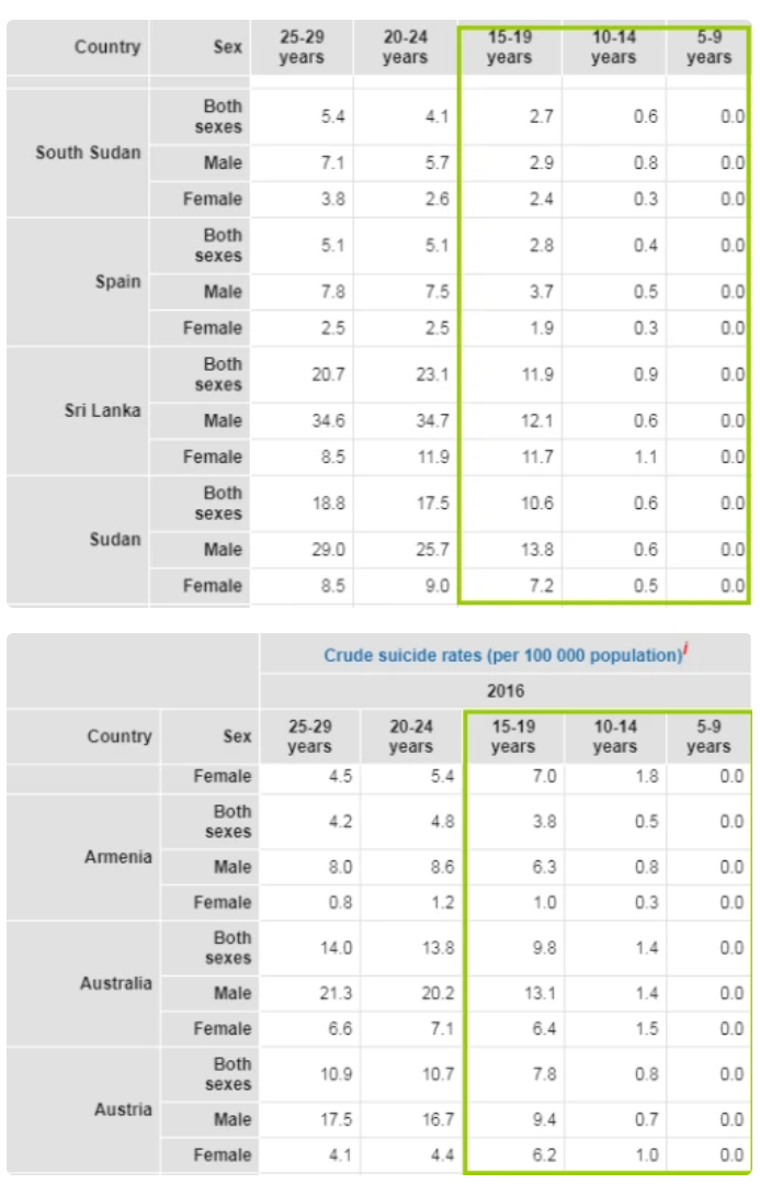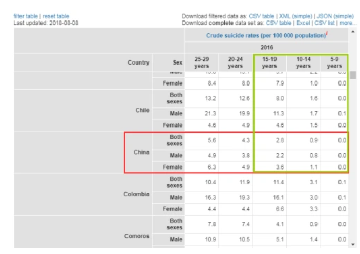 这里要提一下,这几年国内互联网上长期存在一个找不到来源出处的谣言被广泛引用,内容是“据英国经济学人统计中国青少年自杀率世界第一等等”,实际上只要打开世卫网站就可以看到各年龄段的相关数据统计,下图可以看到同整体自杀率一样,青少年自杀率这方面我国也并未排在前列。从世卫统计数据整体上看,整体上的自杀率,中国排在70左右,自杀率比我国高的国家多数都是发达国家,比我国低的基本都是发展中国家。所以我们可以认为这是一个现代性为主的问题。