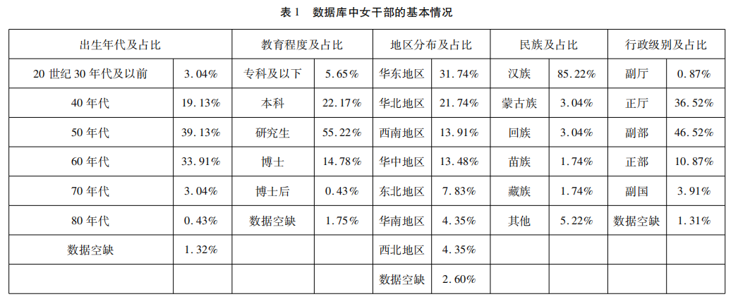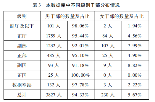 本文数据来源于中国官员信息数据库,这个数据库完整收集了政府网站上公开的以下四部分官员的信息:(1)全国地级市和直辖市区县的党委书记、市(区、县)长;(2)所有省委常委;(3)所有省委书记、省长;(4)第15~18届所有其他非军职中央委员、中央候补委员。数据库中,共有厅级以上男干部3827人,女干部230人。我们按照性别筛选出女干部的数据,整合成为一个包含230名女干部相关信息的小型数据库。这些女干部的行政级别最低为正厅级(其中有两名女干部高职低配,处在正厅级的职位上,但行政级别是副厅),在2000-2015年间,59.13%的女干部(136人)到达了副部级。与中国公共部门中其他的女性相比,她们是公共管理中晋升到最高层的女性群体。