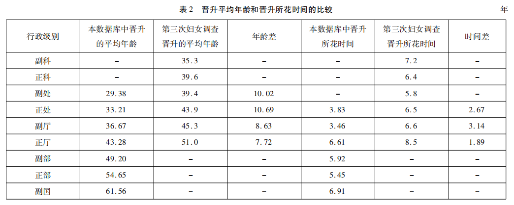 《第三期中国妇女社会地位调查》中,由低一级行政级别晋升到上述行政级别所花的时间及晋升时的平均年龄依次为副科7.2年,35.3岁;正科6.4年,39.6岁;副处5.8年,39.4岁;正处6.5年,43.9岁;副厅6.6年,45.3岁,正厅8.5年,51.0岁。比较本数据库中的女干部与《第三期中国妇女社会地位调查》中的女干部晋升到各行政级别的平均年龄。两个数据库的年龄差分别为副处级相差10.02岁,正处级相差10.69岁,副厅级相差8.63岁,正厅级相差7.72岁(见表2)。这表明,本数据库中女干部初任某一级别职位的平均年龄较低。这是一个重要的发现。换言之,当其他的女性还在为晋升副处级而奋斗时,本数据库中的女干部一般已经晋升到副厅级,并且在为晋升正厅级做准备,当其他女干部晋升到正处级时,数据库中的女干部一般已经晋升到了正厅级。