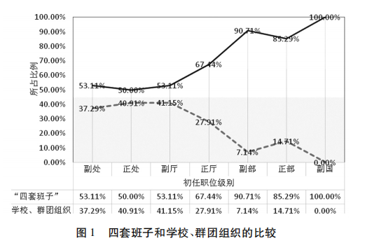 在中国,影响女性晋升的组织因素呈现出迥然不同的特点。中国女干部的晋升中存在着“旋转门”现象,然而,这种“旋转门”现象区别于西方国家的“旋转门”。主要为:第一道“旋转门”表现为女干部从学界或者群团组织流向政界,主要发生在副厅晋升至正厅之间。如图1所示,41.15%的女干部在学校、群团组织获得初任副厅级职位的机会,而后部分在“四套班子”内获得更高职位的晋升。第二道“旋转门”表现为女干部从政府、党委流转到人大、政协,一般发生在正厅晋升至副部之间。在本数据库中,在人大、政协获得副处、正处、副厅、正厅初任的寥寥无几,仅有一人在人大获得副处级初任,另有一人在政协获得正厅级初任。而到初任副部、正部及副国级时,来自人大、政协的比例开始上升,分别为11.02%、34.48%、55.55%。
