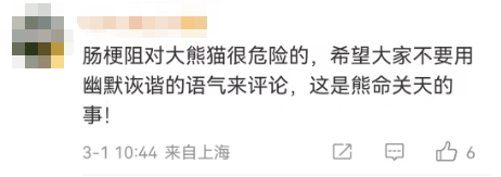 肠梗阻在熊猫中是较为少见的疾病,发病机理不详。关于网友普遍猜测的病因和病症,某知情人士向东方网记者表示,“不能简单的将人类和熊猫的情况等同在一起。最终的结论以及治疗方案还是要以野生动物专家的判断为准。”