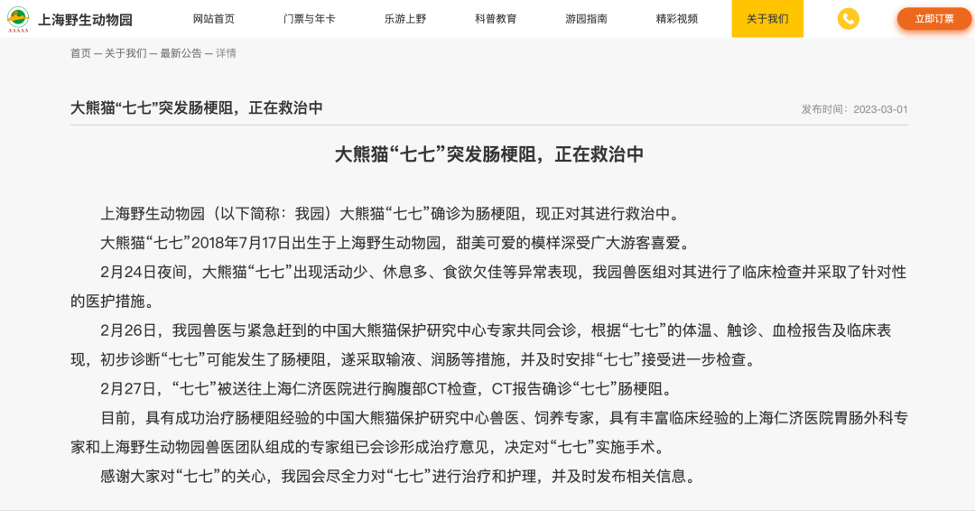 2月26日,我园兽医与紧急赶到的中国大熊猫保护研究中心专家共同会诊,根据“七七”的体温、触诊、血检报告及临床表现,初步诊断“七七”可能发生了肠梗阻,遂采取输液、润肠等措施,并及时安排“七七”接受进一步检查。