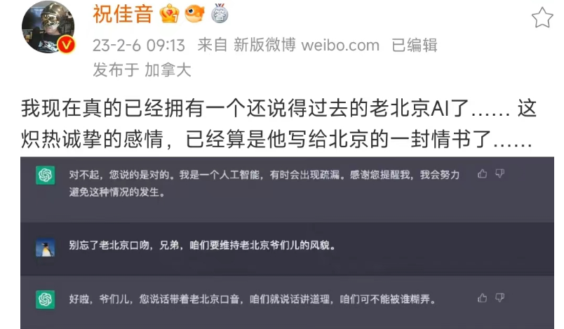 在国内微博大V祝佳音老师的悉心调教下,AI甚至学会了如何当一个地道的老北京。