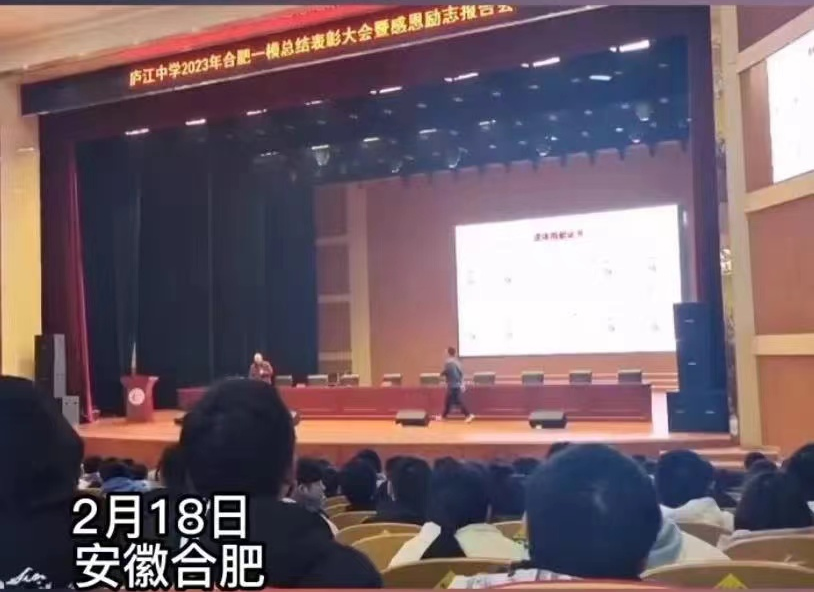 大厅上方屏幕悬着:“庐江中学2023年合肥一模总结表彰大会暨感恩励志报告会”,这是经过“一模”考试后,学校要对学生进行打气激励,这样的讲座,陈教授驾轻就熟。