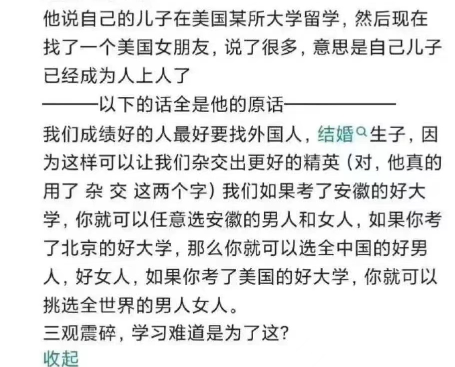 即便不提“杂交”正确性,这读书目地也不对啊,读好大学就是为了配种、搞钱?