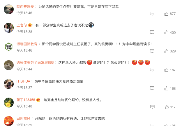 在这次的新闻底下,很少有人去指责学生的问题,而是都将矛头指向教授,甚至批评学校为什么要找这样一个人来做演讲。