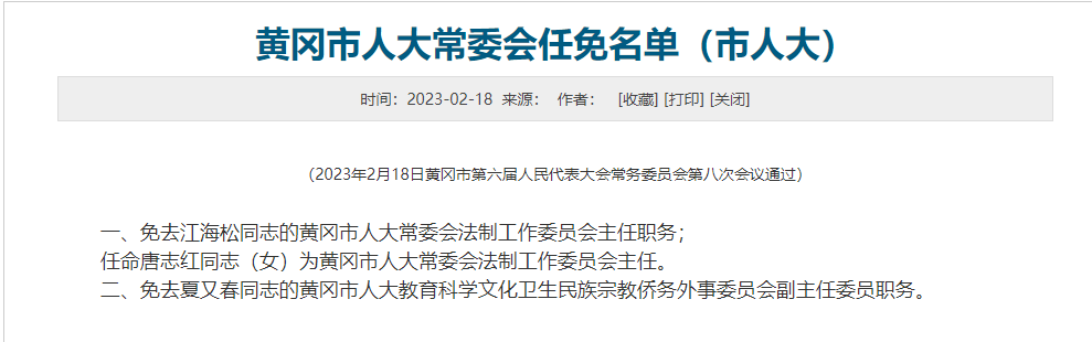 大皖新闻讯 2月18日,湖北黄冈市人大常委会发布的一份任免名单引发关注,该名单中任免了多位黄冈市人大常委会职务,其中包括“任命唐志红同志(女)为黄冈市人大常委会法制工作委员会主任”。