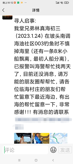 寻人信息显示,男子林真海,2023年1月24日在湛江市坡头区南调街海油社区003鱼排钓鱼时不慎掉进海里(还有一条8米小船飘离,最初人船分离),已报警并有海警帮助寻人,但还没有消息,家属恳请临海村庄和出海的朋友帮忙留意。