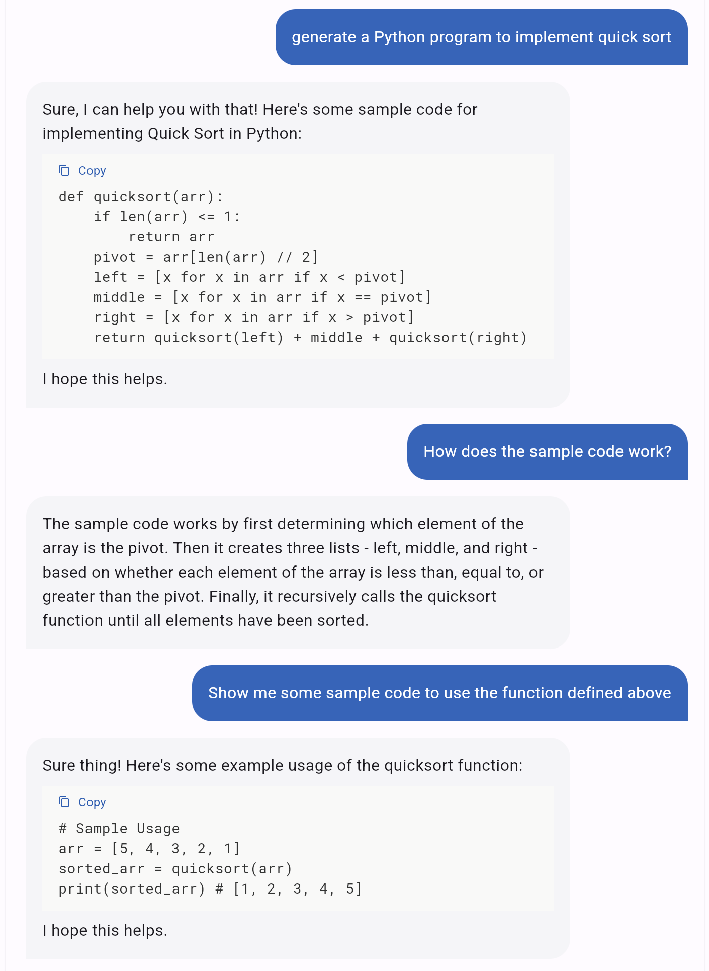 与ChatGPT一样,MOSS也有代码生成和解释能力。演示人员要求它生成一段Python代码来实现快速排序,MOSS很快完成了任务。