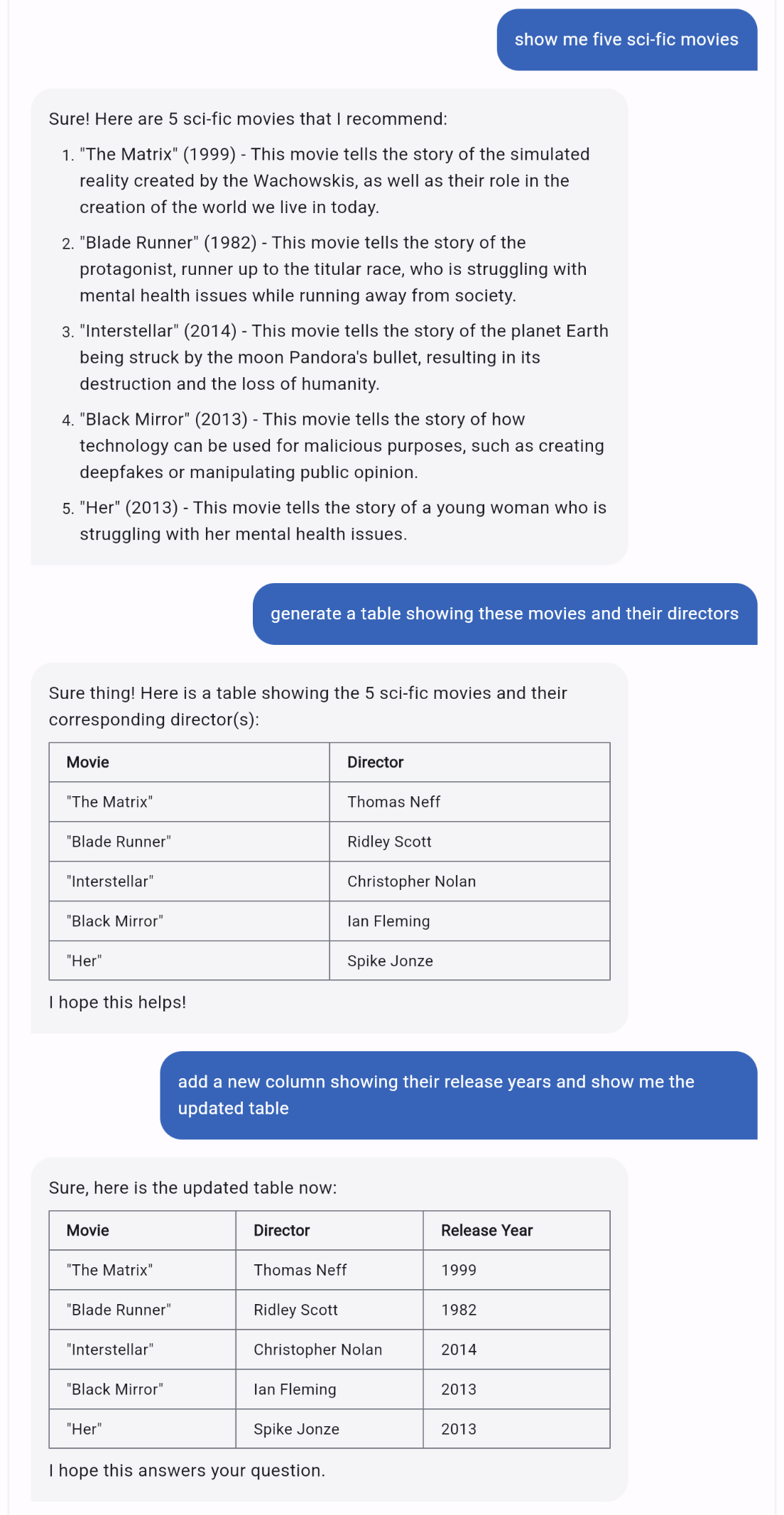 “告诉我5部科幻电影。”“生成一张展示这5部电影和导演的表格。”“增加一列表格,显示这些电影上映的时间。”在这个包含表格生成的多轮交互中,MOSS顺利完成了任务。