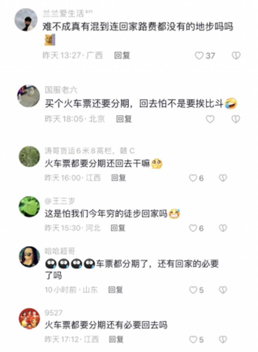 人们对有钱人家的少爷卑躬屈膝,奴颜谄媚,对精打细算的普通人却刻薄挖苦,冷眼视之。俗话说,有钱没钱,回家过年。过年,最重要的是一家人团团圆圆,用花呗分期买个火车票真的就那么丢人吗?分期购买火车票的人就不配回家了吗?