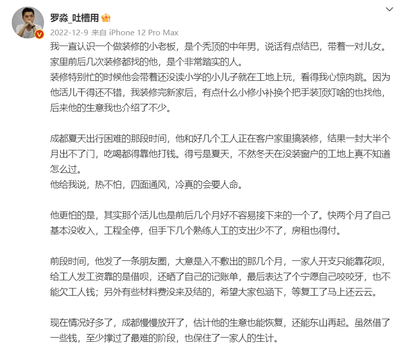 在微博上有个叫罗淼的博主就分享过一个很现实的故事。一个开装修公司的老板在疫情最严重的那几个月,收入停滞,一家人吃饭、生活都是靠花呗,给装修工人发工资的钱都是靠的借呗。疫情过去后,凭借多年的口碑积累,他的装修生意又慢慢恢复了。