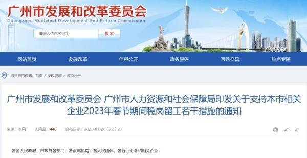 1月20日,广州市发改委在其官方网站发布了广州市发改委会同有关部门起草的《关于支持本市相关企业2023年春节期间稳岗留工的若干措施》,共提出四个层面的10条措施,其中提到: