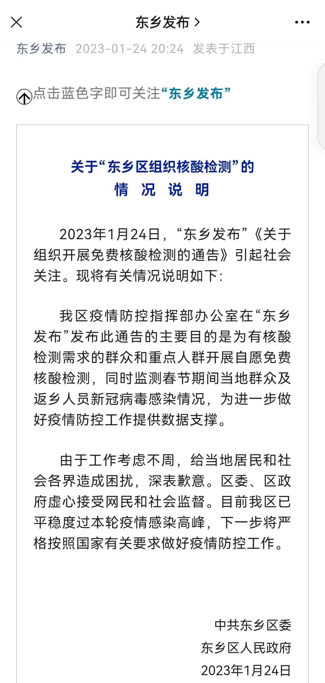 事情缘起于一条公众号推送。24日,公众号“东乡发布”推送了江西省抚州市东乡区新冠肺炎疫情防控应急指挥部办公室发布的一则《关于组织开展免费核酸检测的通告》。