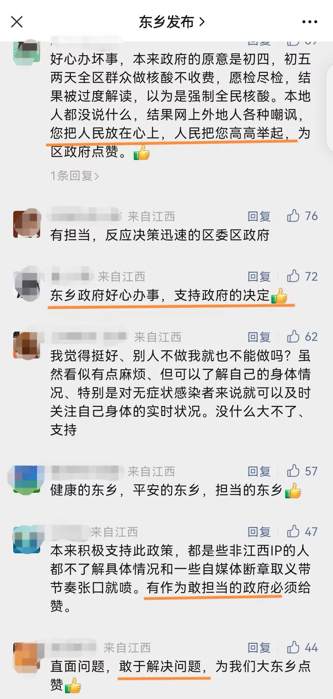 “都是些非江西IP的人都不了解具体情况和一些自媒体断章取义带节奏张囗就喷。有作为敢担当的政府必须给赞。”“直面问题,敢于解决问题,为我们大东乡点赞。”“你们是为人民负责的,谢谢。”