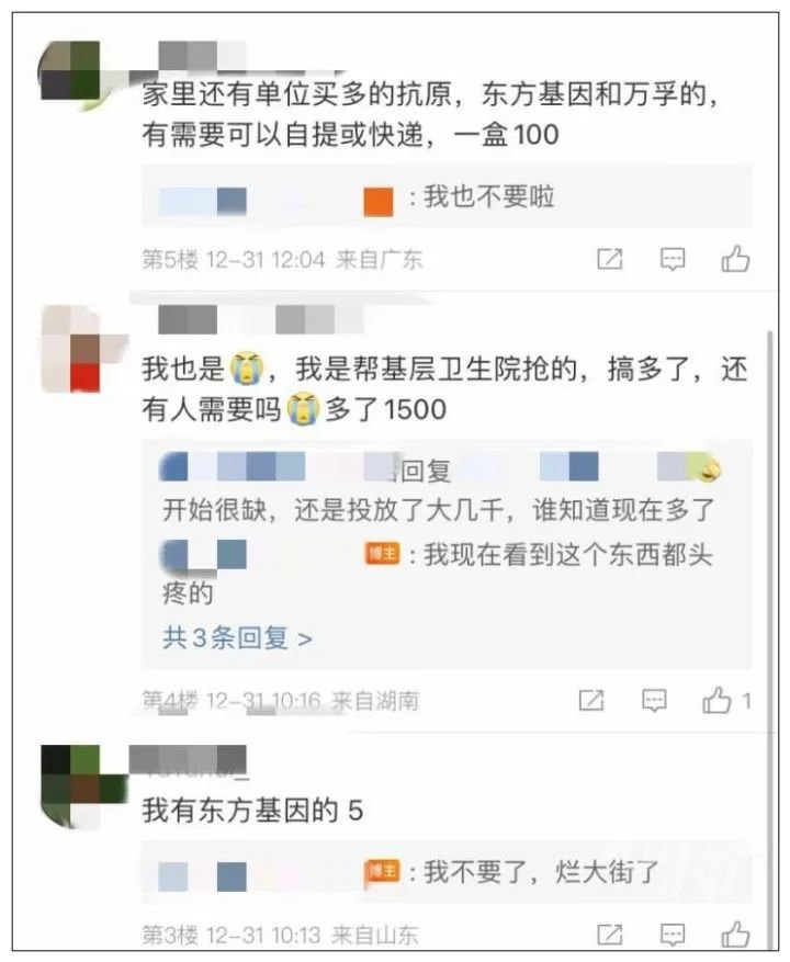 不巧的是,这条微博不仅没有求到买家,反而带出了更多转让信息,有网友在评论区留言:“帮基层卫生院抢的,多了1500个。”