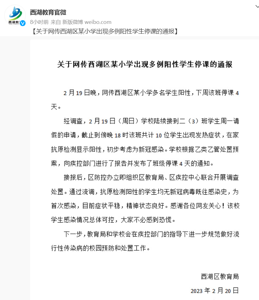 2月19日,浙江杭州市的三所当地学校在学生中发现了新的新冠病例,杭州市疾控中心称这些学生都是首次被感染新冠病毒,西湖区有10名学生报告呈阳性感染,拱墅区有5名学生感染,而上城区有12名学生报告有发烧症状。西湖区教育部门宣布,学生全班停课四天。