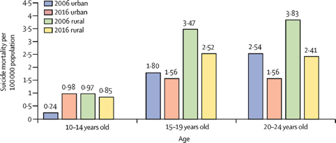 另据卫生统计年鉴,在15~19岁的群体中,农村青少年自杀数据高于城市。2006年,农村15~19岁儿童青少年自杀率为3.47/10万人,城市为1.8/10万人;2016年,农村这一年龄段儿童青少年自杀率为2.52/10万人,城市为1.56/10万人,农村青少年的自杀率分别是城市青少年的1.92和1.61倍。