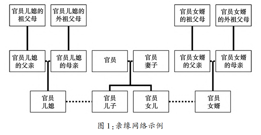 接下来,本文建构了一个指标———亲缘网络的地方化程度——来衡量每一位官员亲缘网络在地域上集中的程度。每一个网络都由两方面组成:即官员自己的核心家庭,以及与其子女联姻的家族。亲缘网络理应包括血缘纽带与姻亲关系。图1展示了一个亲缘网络的例子。在古代中国,婚姻特别是精英之间的联姻是最大化权力与降低风险的交易。这些婚姻纽带需要精英投入和关注以赢得好感、培植信任,并在特定的政治议程上互惠互利。长远来看,这可能会扩大精英的家庭财富。在此,联姻关系就非常重要了,即便它不比血缘关系更重要,它至少也和血缘关系一样重要。