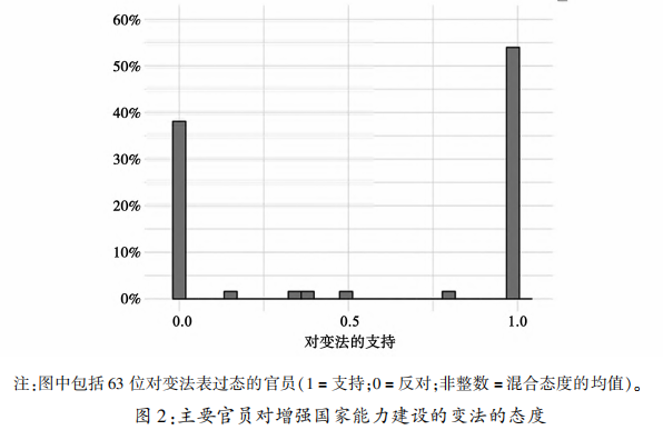 正如图2所示,官员的态度是两极分化的。在63位对变法公开表达看法的官员中,有34位官员(54%)一如既往地支持变法(编码为1),有24位官员(38%)对变法持续表示反对(编码为0),而剩下的5位官员支持变法中的一些政策,反对另外一些政策,我在主分析中对他们的态度取了均值。