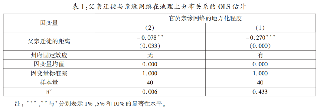 表1展示了我用最小二乘法(OLS)对父亲迁徙与官员亲缘关系地方化程度之间关系的估计。如果官员的父亲迁徙了很远,那么官员本人就越有可能拥有一个遍布全国的亲缘网络。当纳入官员家乡所在州府固定效应,即控制了诸如地理、历史与当地文化在内的家乡层次的协变量后,结果依然是稳健的。