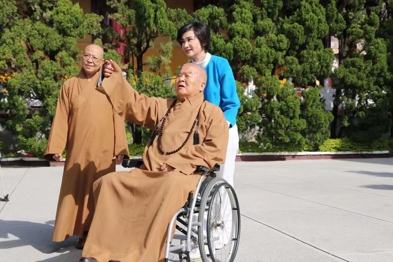 星云大师晚年眼力不佳,但是仍然笔耕不辍,练就了下笔一气呵成的一笔字书法。有一年,他到深圳参加一笔字书法展,和参观者会面,我作为主持人陪伴着他,当时他推着轮椅进场,旁边群众万头攒动,他一到场,面对群众就说了一句话,他说很不好意思,让大家来看我,我就坐在这里,我同样的是一个鼻子,两个眼睛,我没有什么特别。