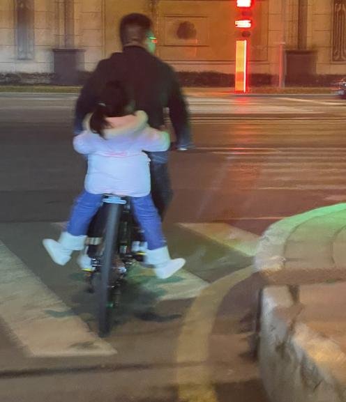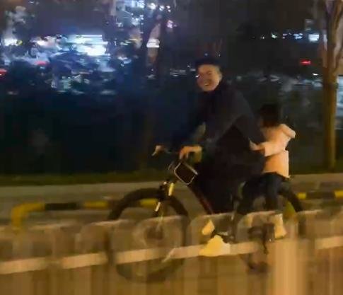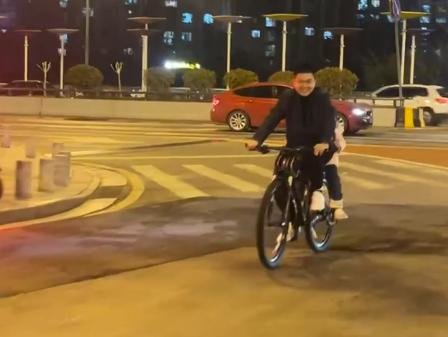 “那时候女儿都已经在车上坐着了,但是我女儿看见我公公把自行车推出来,就非要下车,要去坐自行车。”曾女士的女儿即将4岁,平日里,骑过带辅助轮的小自行车,但从未被大人载着坐自行车。在女儿坐上车前,曾女士交待好女儿要注意把脚分开,也要记得抓紧父亲。“当时在路上担心有车不安全,我就开着车慢慢在后面跟着。”这一幕,被坐在车上的朋友拍下。