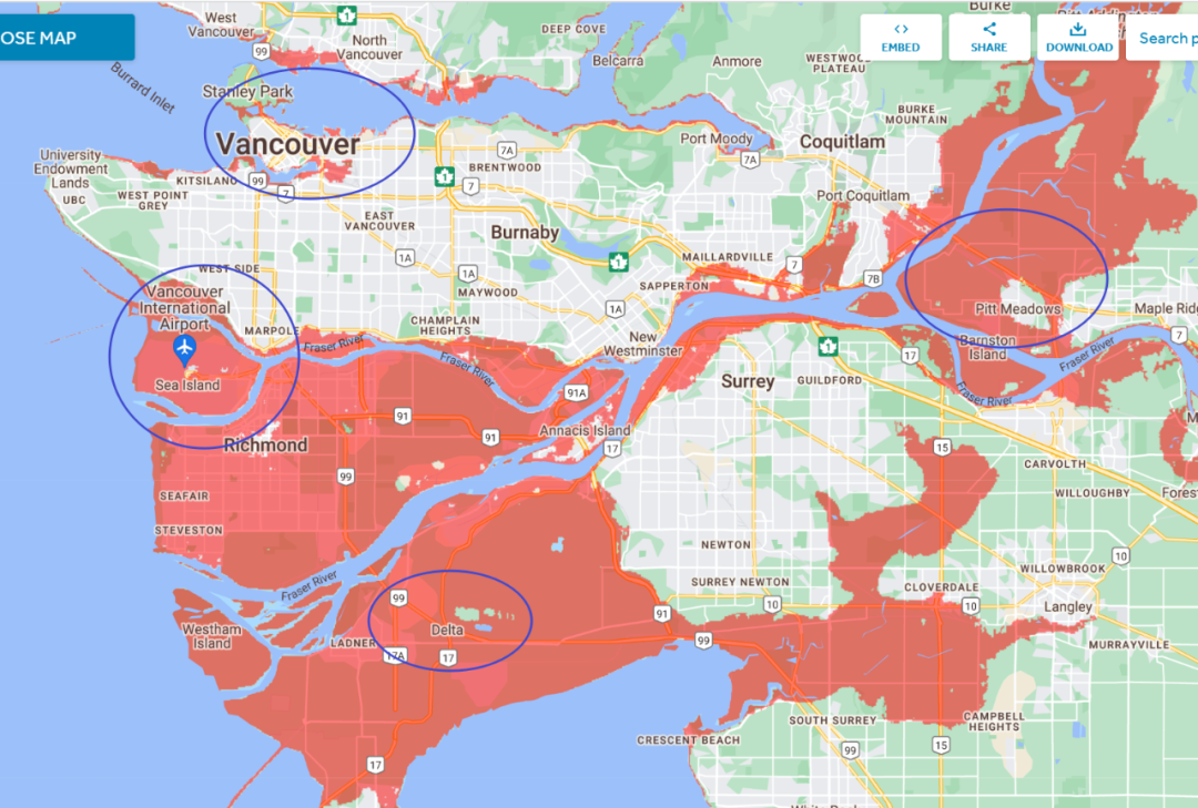 地图上几乎一片“血红”,地势低洼的列治文和三角洲几乎全城覆没,温哥华国际机场也无法幸免。