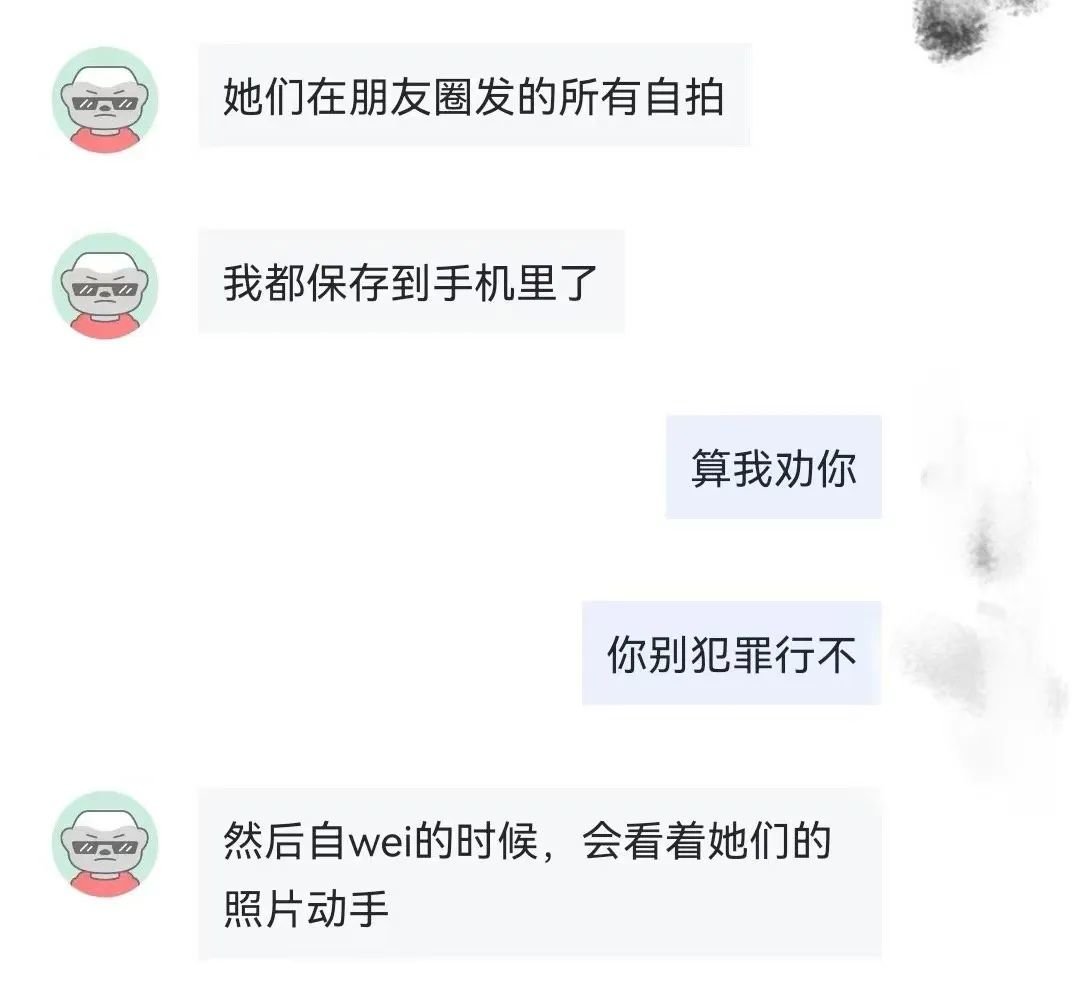 还声称“她们有对象,不是处女,不干净”“自wei的时候,会看着她们的照片动手”。