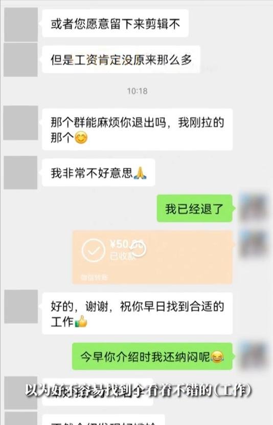 HR跟吴先生说,如果愿意留下来可以剪辑,但是工资肯定没之前的高。随后,HR让吴先生退了公司群。