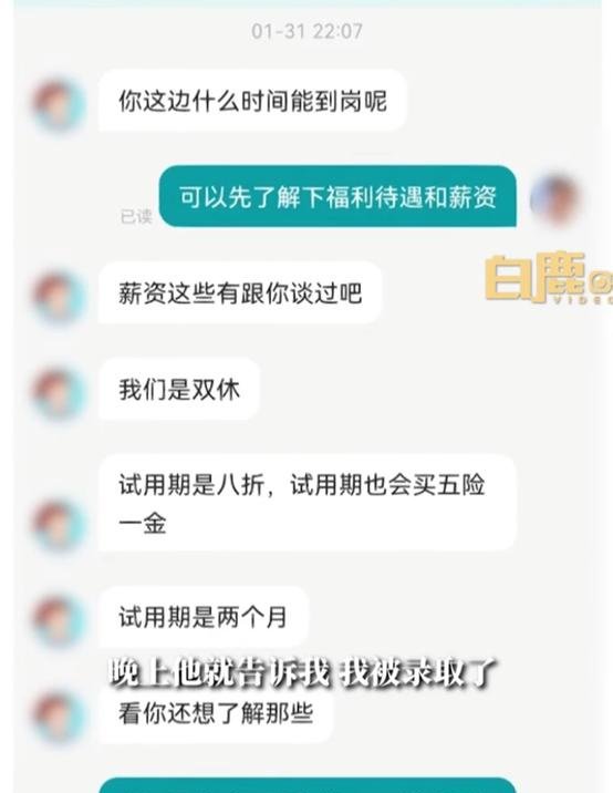 聊天记录显示,1月31日,当事人吴先生曾与HR在招聘平台沟通,HR问他什么时候可以到岗,他表示想要了解一下薪资,HR称薪资已经谈过,公司是双休,试用期是八折,也会买五险一金。