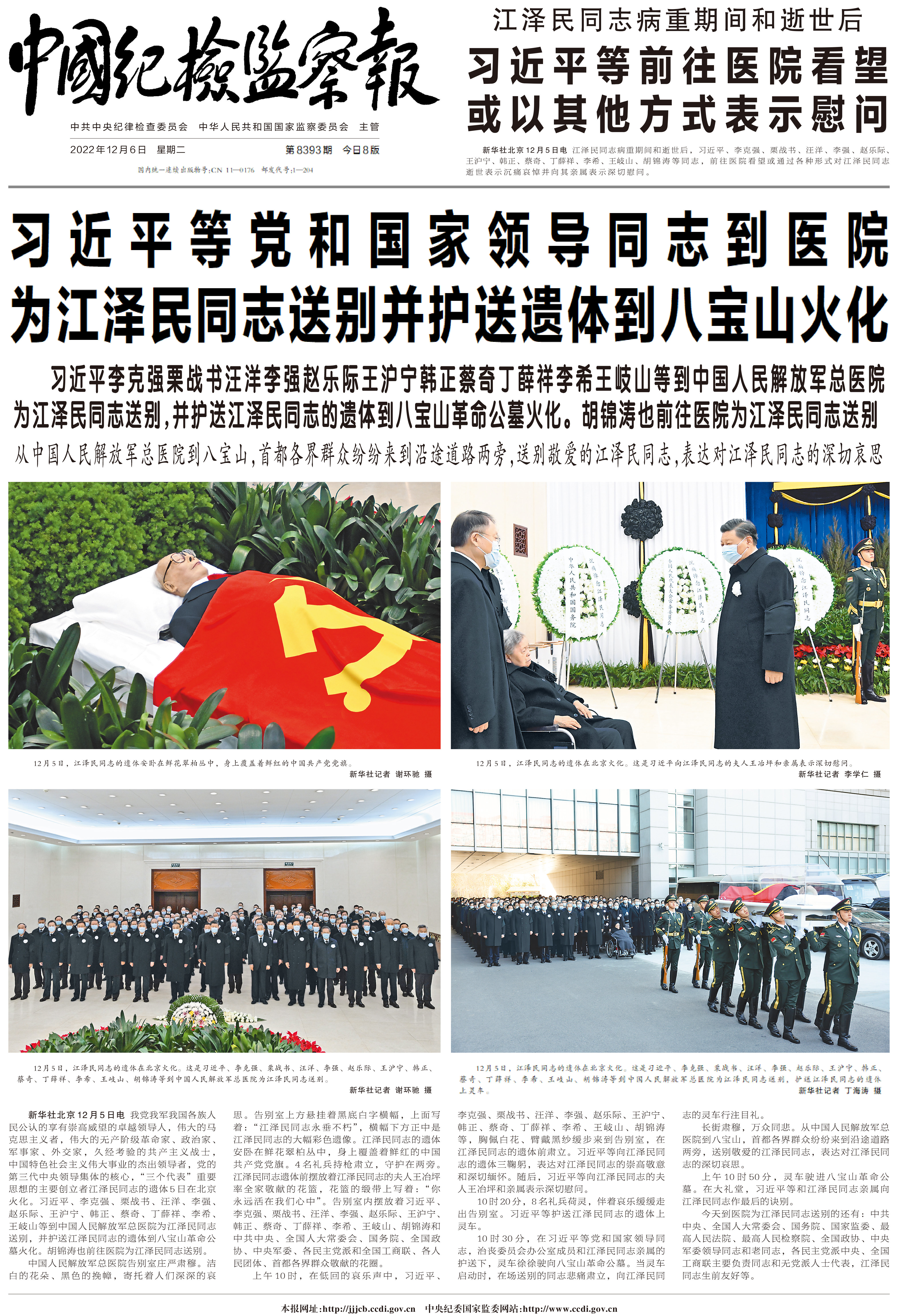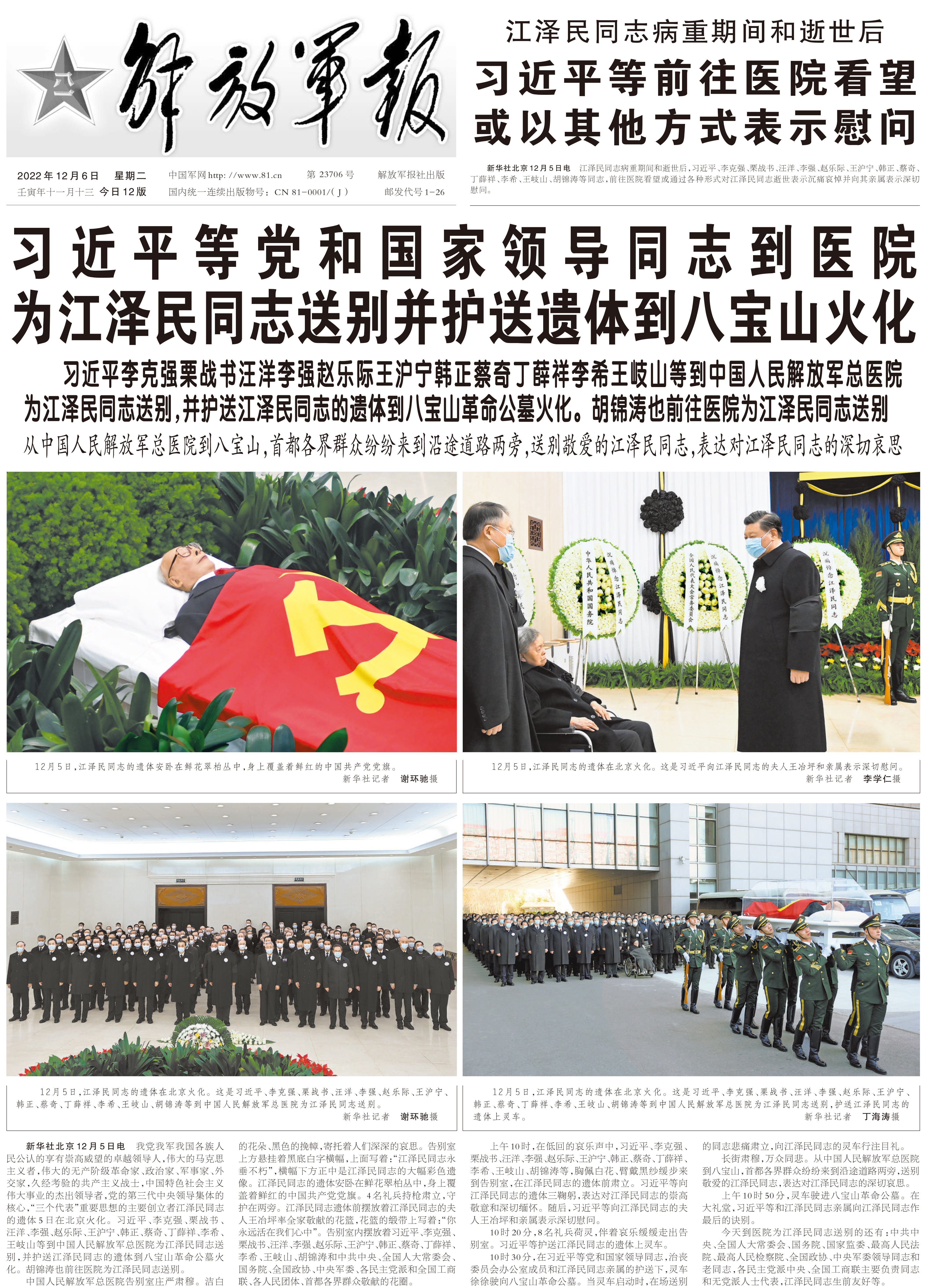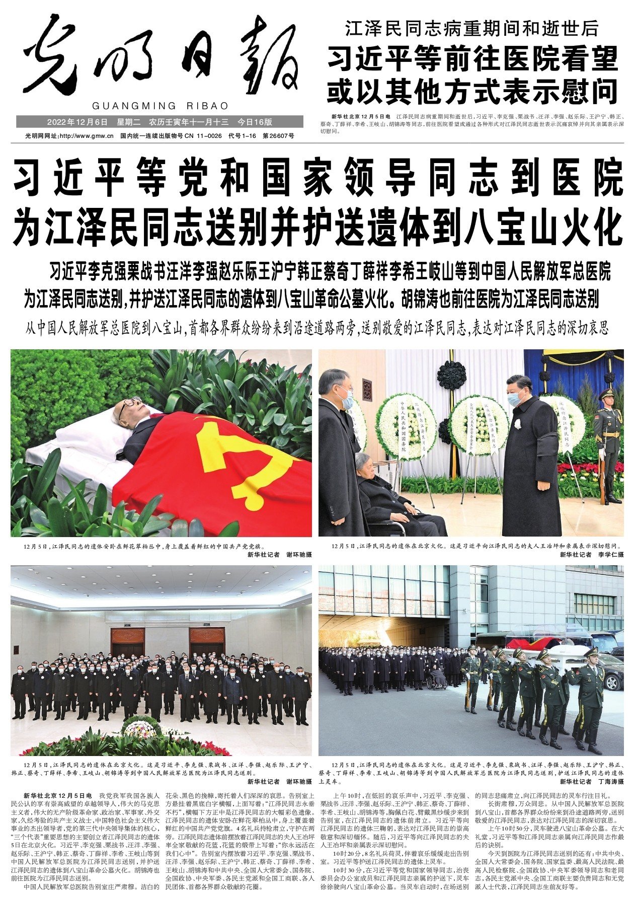 12月6日出版的《人民日报》、《新华每日电讯》、《光明日报》、《解放军报》、《经济日报》、《中国纪检监察报》等央媒在头版集中刊发《习近平等党和国家领导同志到医院为江泽民同志送别并护送遗体到八宝山火化》文章和图片,表达深切哀思。