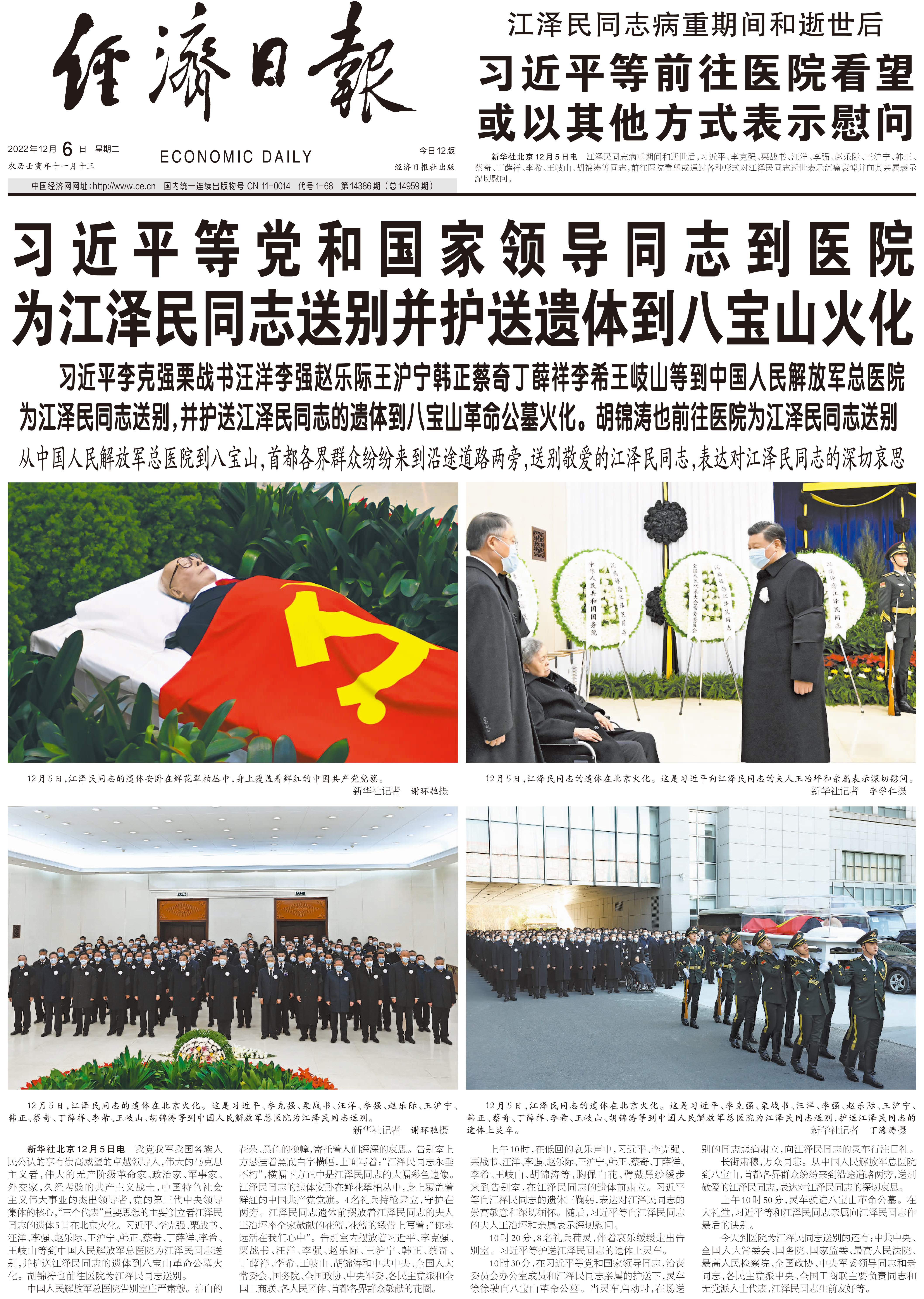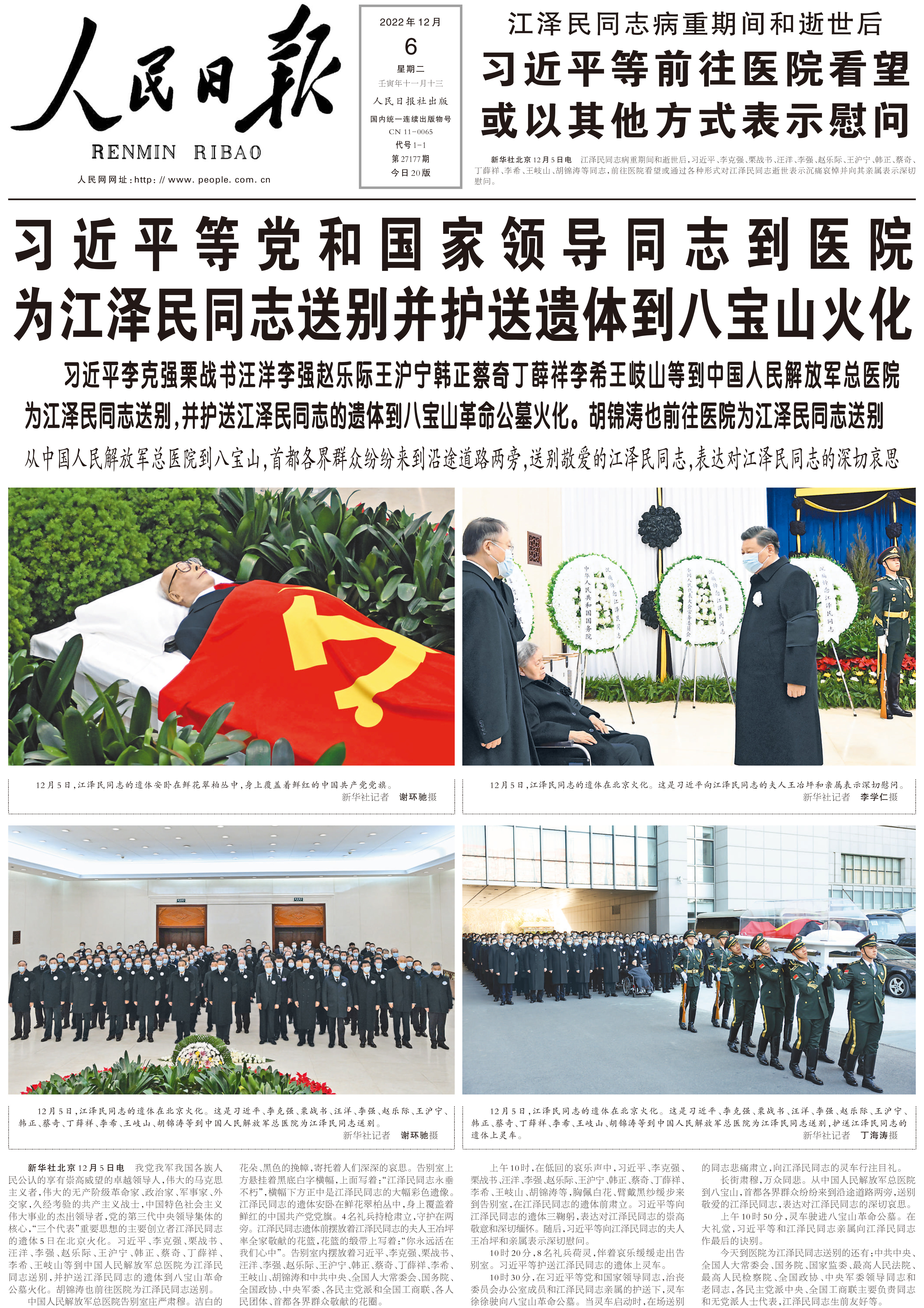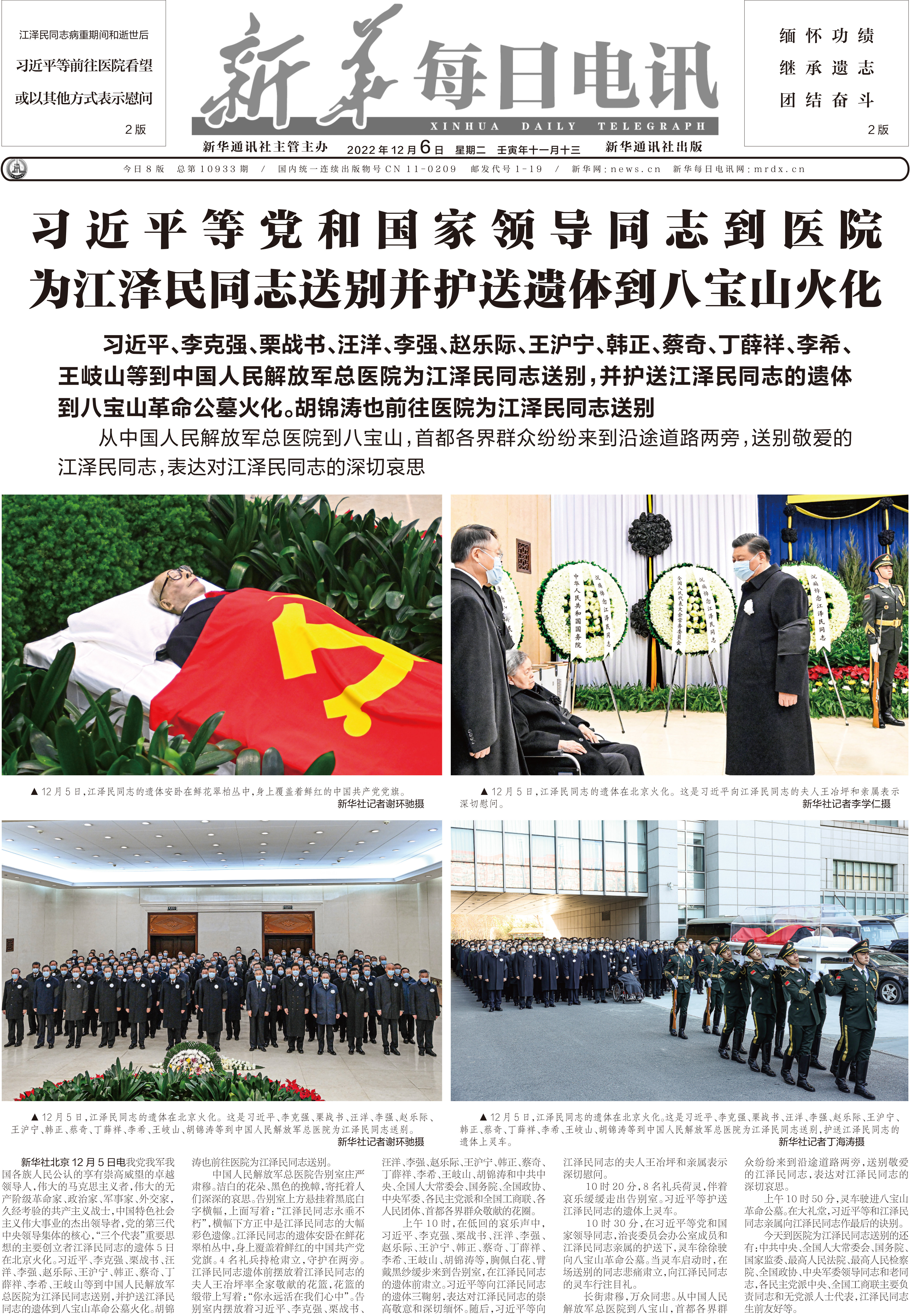 12月6日出版的《人民日报》、《新华每日电讯》、《光明日报》、《解放军报》、《经济日报》、《中国纪检监察报》等央媒在头版集中刊发《习近平等党和国家领导同志到医院为江泽民同志送别并护送遗体到八宝山火化》文章和图片,表达深切哀思。