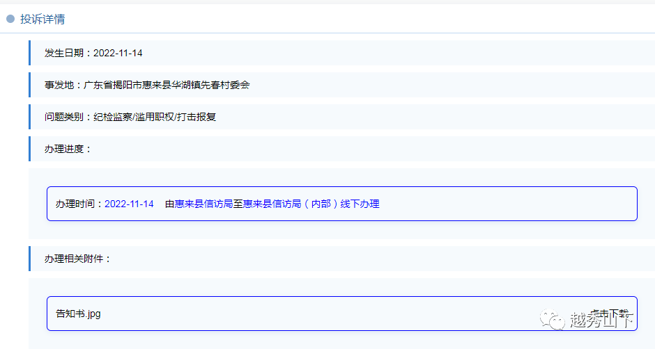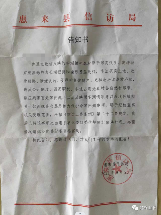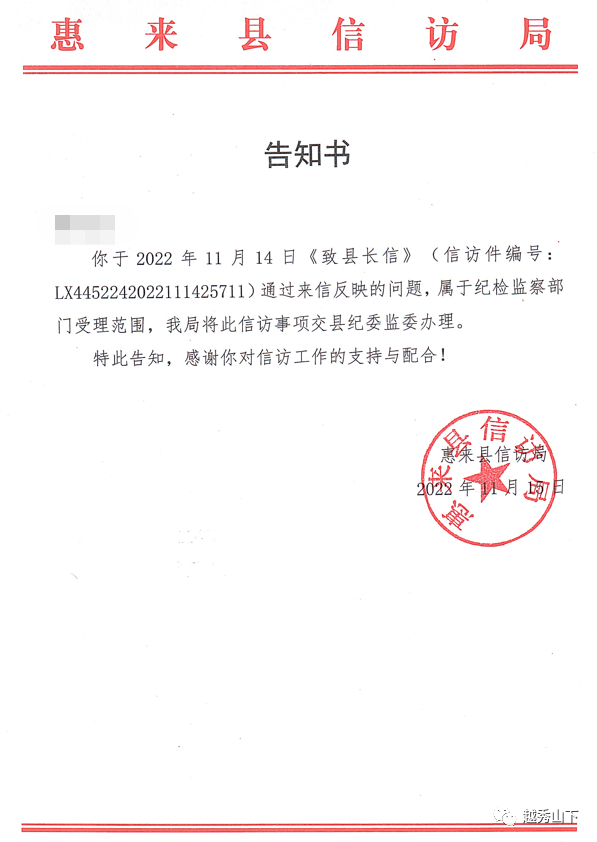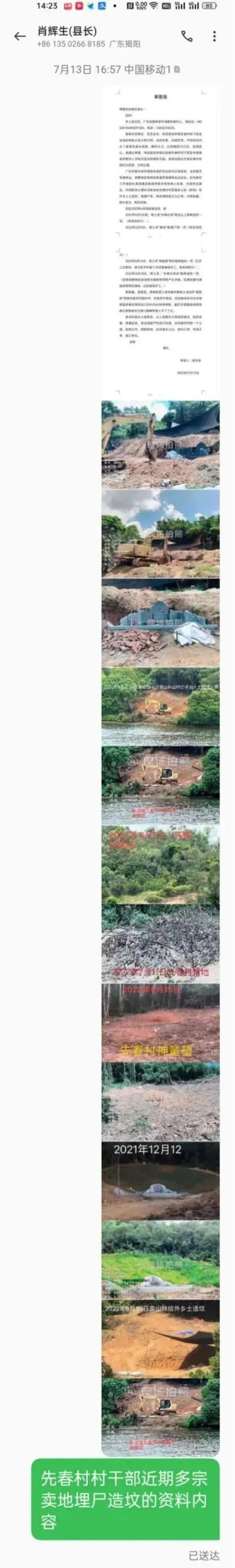 2022年8月,广东省自然资源厅转了一份由惠来县自然资源局给揭阳市自然资源局信访科的《情况说明》,在该情况说明中,惠来县自然资源局称,惠来县纪委已于2020年11月2日将该问题线索转给华湖镇纪委组织核查办理,2021年9月25日华湖镇纪委完成初步核实并研判,认为该案件涉嫌触犯《中华人民共和国刑法》有关规定,将调查情况报告县纪委。县纪委认为相关调查材料欠缺,将该案件退回华湖镇纪委补充核查。