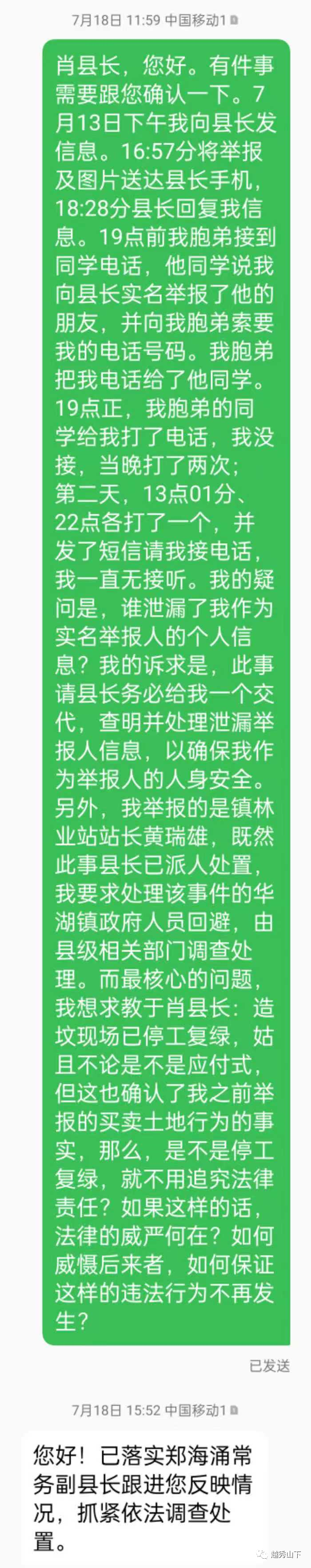 15:52,肖辉生县长再次回复短信:您好!已落实郑海涌常务副县长跟进您反映的情况,抓紧依法调查处理。