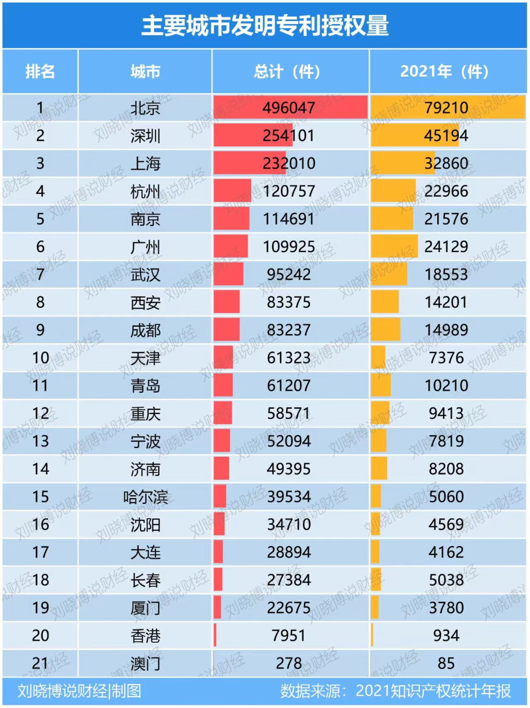 以发明专利数量来看,2021年广州发明专利数量近11万件,位居全国第6,重庆只有5.86万件,位居第12位。